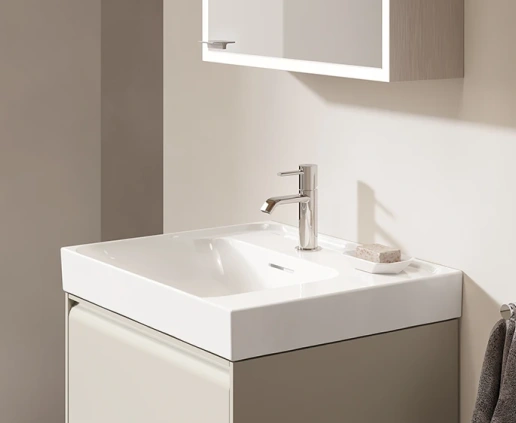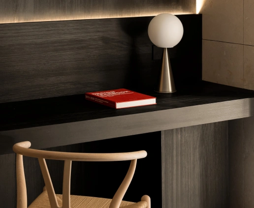 Soft neutral tones, natural oak finishes, and textural stone details define the interior — designed to evoke calm and sophistication.